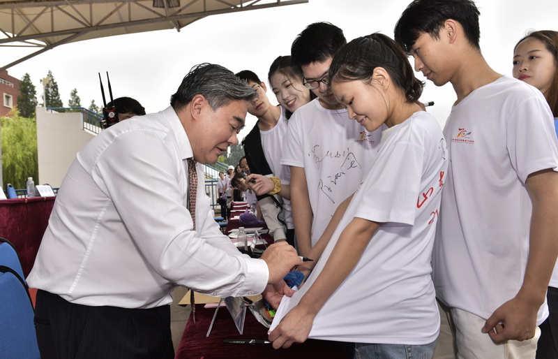 校领导、校党委领导班子成员罗公利、姚庆国、尹华、周东华、夏侯雪娇、孙鹤汀、张英杰、李玉霞、曾庆田、李克周、陈涛及有关部门、各学院主要负责人在主席台就座。来自全国各地的100余名校友组成“观礼团”现场为毕业生送上美好祝愿。全体毕业生身着统一文化衫,齐聚体育场,再一次聆听领导老师的谆谆教导、殷殷叮咛,感受母校的深情厚意。校党委书记罗公利、校长姚庆国为部分毕业生签名并合影留念。