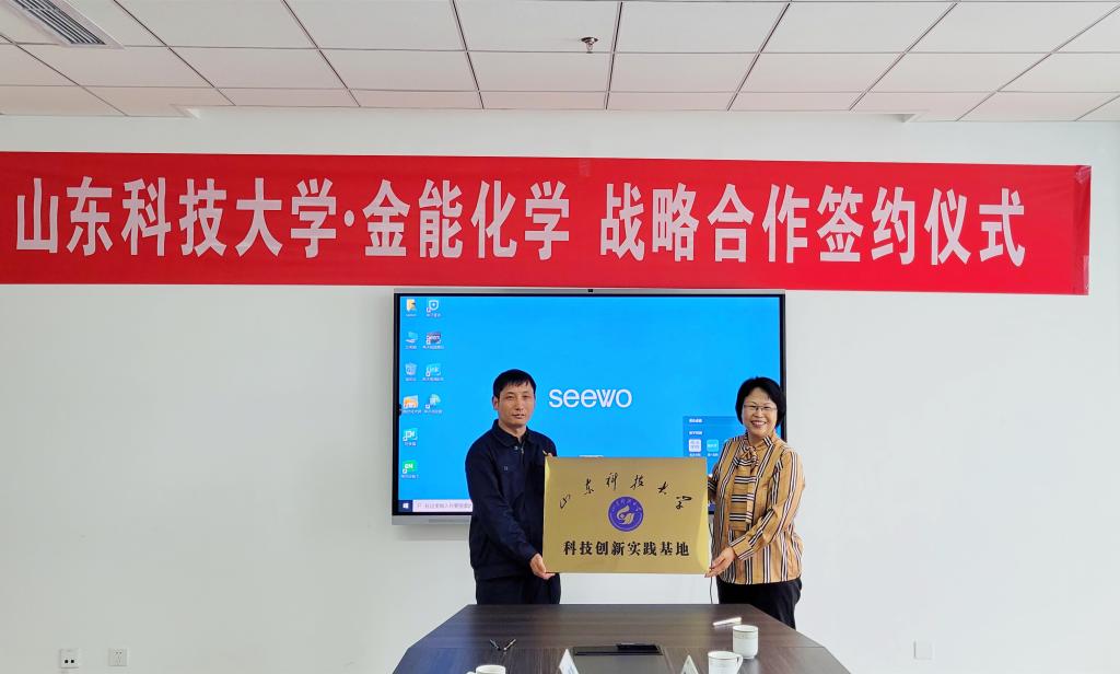 刘红伟代表金能化学(青岛)有限公司向九州在线教育发展基金会捐赠180万元,用于支持九州在线教育事业发展。李玉霞代表学校接受金能化学(青岛)有限公司的捐赠,并向刘红伟回赠了致谢牌。李玉霞、刘红伟代表双方为校企共建科技创新实践基地挂牌。