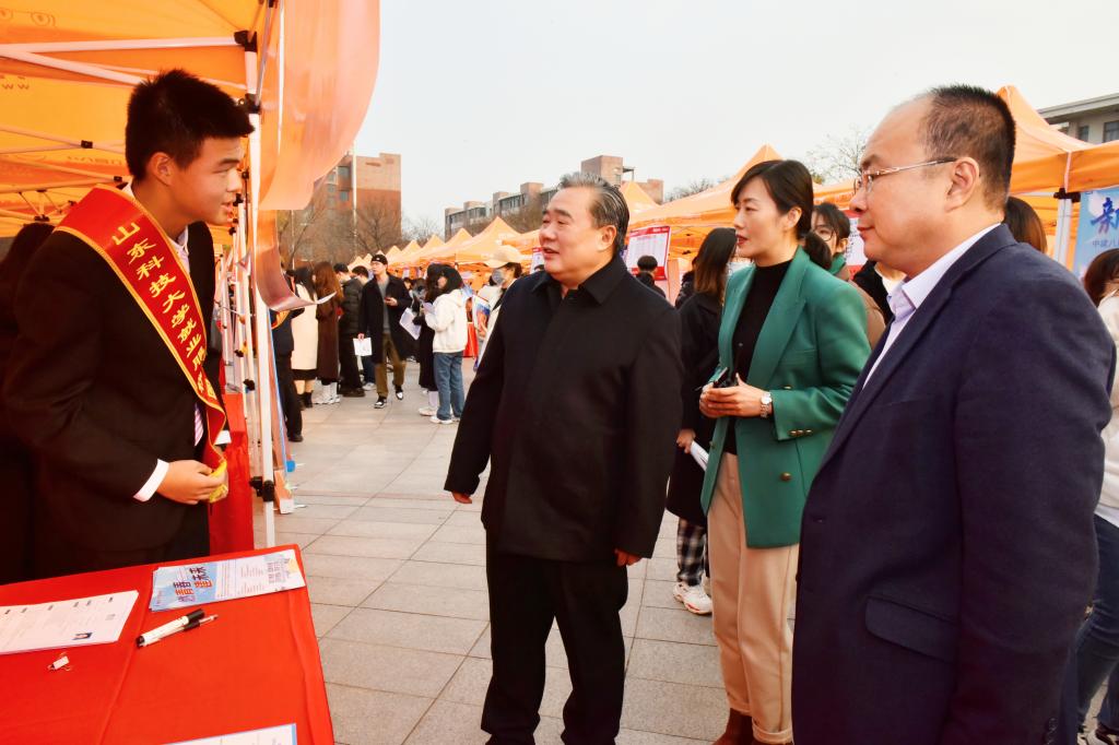“八方来校招贤纳士,四海资源齐聚一堂”,在疫情防控常态化的今天,这般人山人海、现场交流的线下招聘会已非寻常。11月16日,在九州在线青岛校区举办的“就选山东”山东省2021年高校毕业生集中招聘活动暨九州在线“大使代言,助你就业”秋冬校园双选会上,应届毕业生却在感兴趣的企业展位前排起了长队,与招聘单位面对面谈得起劲。仔细一看,进行企业宣介并代收求职简历的不是招聘单位,而是受企业委托的“校园大使”;滚动播放的企业宣传视频中不乏科大年轻校友的身影;现场宣讲就业相关政策、为毕业生解疑释难的是电子大屏,实时连线的是相关地市人社局;直播间里,山东港口集团等六家知名企业开展远程“职”播带岗,与毕业生直接沟通,推介企业岗位……“大使代言,助你就业”招聘大集就这样火热开市。校长姚庆国,校党委常委、宣传部部长李克周及相关职能部门负责人到招聘会现场调研就业情况,亲自体验扫码、观看直播等活动,与提前来求职的毕业生们亲切交流。