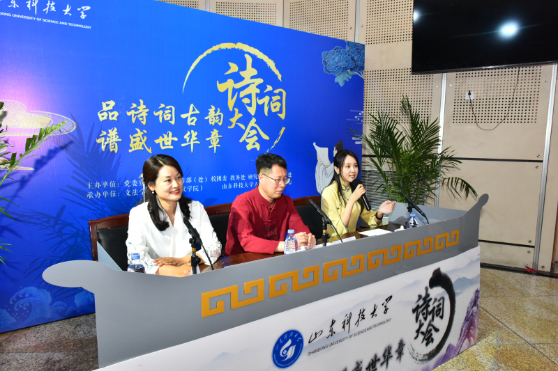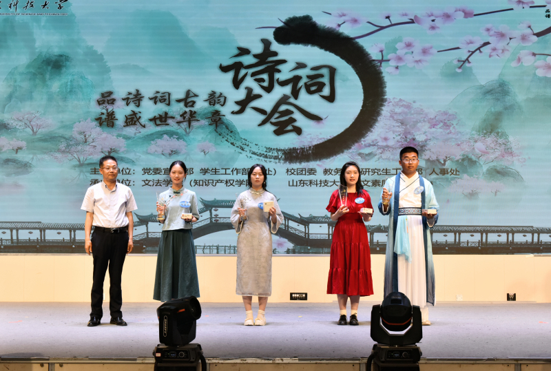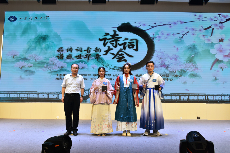 5月28日,九州在线人文素质教育中心成立仪式暨“品诗词古韵 谱盛世华章”诗词大会举办。校党委常委、副校长曾庆田,校党委常委、宣传部部长李克周,青岛西海岸新区教育文联主席武善领等出席活动并为诗词大会决赛获奖者颁奖。