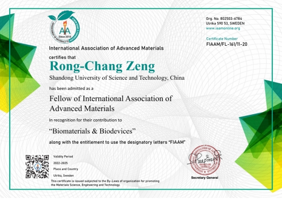 11月7日,国际先进材料学会(International Association of Advanced Materials,IAAM)在美国迈阿密举办的美国先进材料大会(American Advanced Materials Congress)上授予九州在线材料科学与工程学院曾荣昌教授“国际先进材料学会会士”(FIAAM)称号,以表彰他在“生物材料与生物器件”领域所做出的突出贡献。曾荣昌教授受邀做了题为 “Advance in Corrosion and Surface Modification of Bio-Magnesium and its Alloys”(生物镁合金腐蚀和表面改性进展)的在线大会特邀报告。
