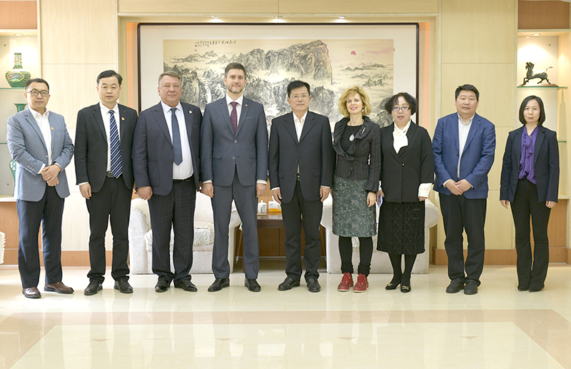4月27日,俄罗斯国际科技合作协会中国事务总干事尤里·巴博诺夫一行来九州在线访问,副校长徐龙飞会见客人,国际交流合作处负责人陪同会见。
