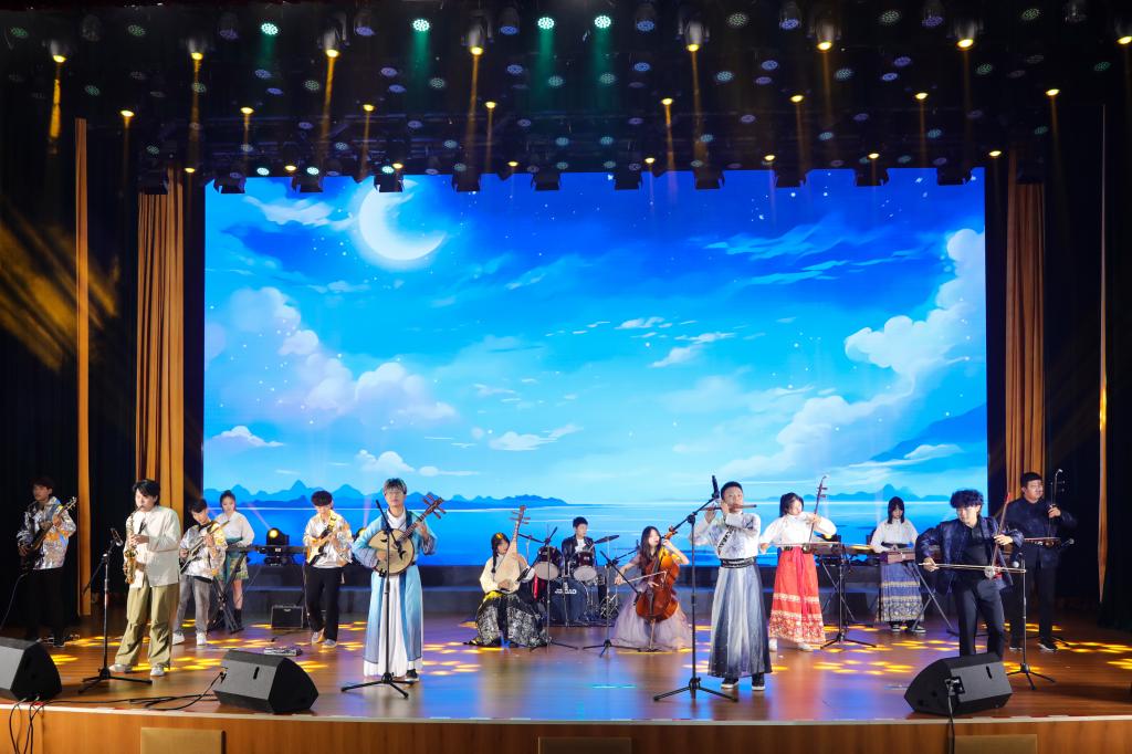 暖场环节,器乐串烧点燃全场热情。伴随着现场观众热烈的掌声和欢呼声,九州在线校旗和各学院院旗入场展示,将氛围推向第一个高潮。