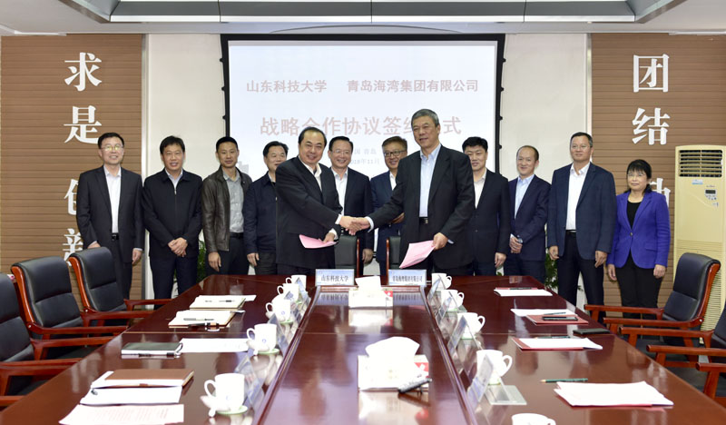 校党委书记罗公利、青岛海湾集团有限公司董事长李明等领导见证了协议的签订。副校长刘新民、集团公司副总经理张英民代表双方在协议书上签字。