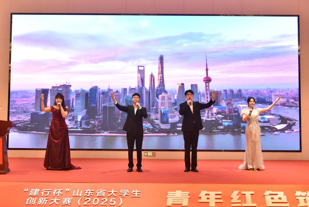 活动现场,与会领导共同启动“建行杯”山东省大学生创新大赛(2025)“青年红色筑梦之旅”活动。山东省教育厅高等教育处处长曾宪文为学生代表出征授旗。
