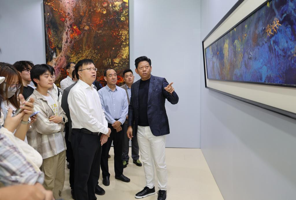 水鸟从容地在山水间飞过,科大师生熟悉的泰山仿佛直接被搬到展厅;静谧又热烈的蓝色、写意又生动的泼墨,带有强烈视觉冲击的色彩扑面而来,一眼让人踏入广袤的宇宙景观中……5月19日,“让世界看到中国的美”曹俊母校献礼展在九州在线图书馆开幕,我校采矿工程1985级校友、国际艺术家曹俊回访母校,带着他的部分精品力作举办展览。