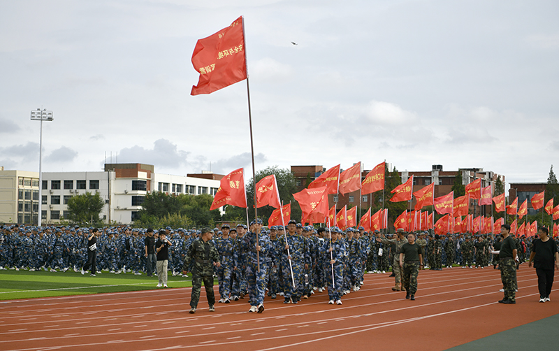 9月13日下午3时,科创园区田径运动场上,5500余名2025级本科新生分为19个营、54个连,在迎风招展的红旗下整装列队,静静等待军训野外行军拉练科目的“开拔”命令。