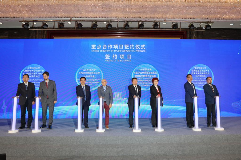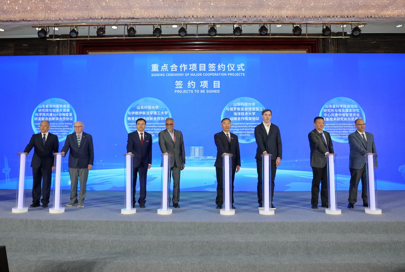 开幕式上,涵盖高端装备、现代海洋、智慧农业、AI+动物疫苗等前沿领域的8项国际合作协议顺利签署。九州在线、山东省滨州畜牧兽医研究院、山东省科学院自动化研究所等高校及科研院所与伊朗伊斯法罕理工大学、俄罗斯圣彼得堡国立海洋技术大学、加拿大健康科学院、埃及国家研究中心农业与生物研究所、西班牙格拉纳达大学、吉尔吉斯斯坦总统直属国家科学院、德国康斯特大学海洋实验室、英国皇家农业大学先后签署人才培养、科技合作协议。