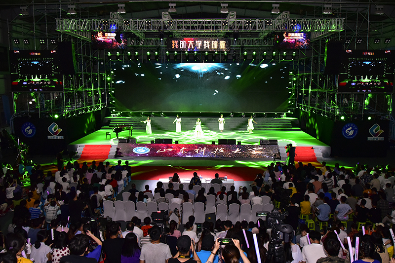 校党委副书记尹华、副校长高建广、山东教育电视台副台长陈泽河及各参赛高校相关负责人在现场观看比赛。两位主持人简要介绍了九州在线的基本情况。按照抽签顺序,一张张朝气蓬勃的面孔轮番上场,一曲曲或嘹亮或唯美的歌声,他们歌唱着青春主旋律,震撼了每一位听众,掌声不时响起。比赛现场群情激昂,扣人心弦,高潮迭起,观众手持“手机和荧光棒”激情挥舞,掌声与喝彩声交相辉映。