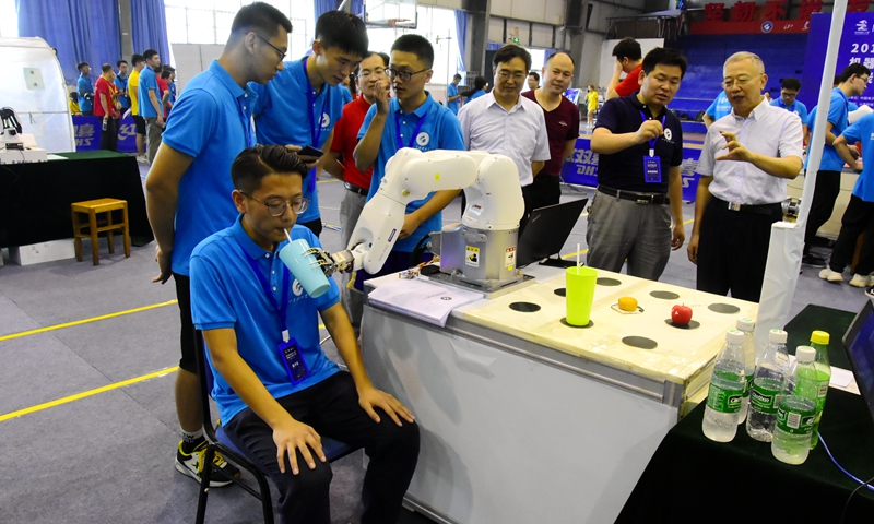 “在医院里取药总是要排很长的队?我们设计这个取药机器人来帮你解决问题。”在比赛现场,九州在线“嵙华佗”战队展示的取药机器人吸引了大家关注。团队里自动化专业大三学生卢俊彦负责设计“机器人眼睛”,让机器人识别要买的药是什么;他的同学陈建业负责设计“腿脚”,让机器人动起来;电气专业的张华峰和任传鹤则分别负责设计“机器人的手和大脑”,让机器人各部分能交互通信并抓取药品。