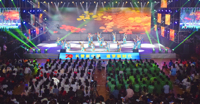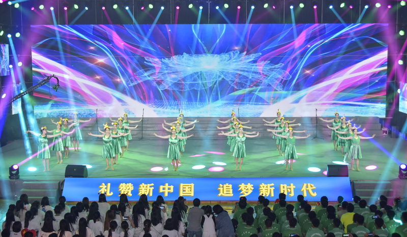 节目精彩纷呈,有的让人兴致盎然,有的让人感动落泪,有的让人激情澎湃,赢得现场观众阵阵掌声……师生在热烈的氛围感染下,全场起立合唱《歌唱祖国》,师生们挥舞着手中的五星红旗,表达对祖国母亲最真挚的生日祝福,唱出对新中国成立70周年的美好祝愿,用青春告白祖国,现场汇成一片红色的海洋。