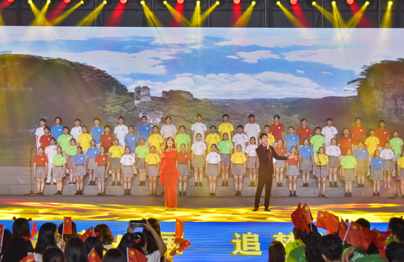 师生们挥舞着手中的国旗,合唱《歌唱祖国》