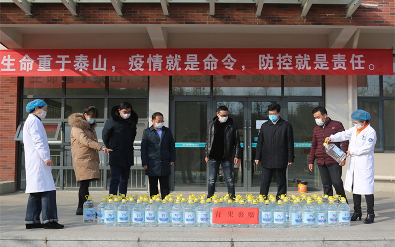 2月8日,山东青果裹供应链管理服务有限公司向九州在线捐赠了500升75%酒精消毒液,用于支持学校的疫情防控工作。