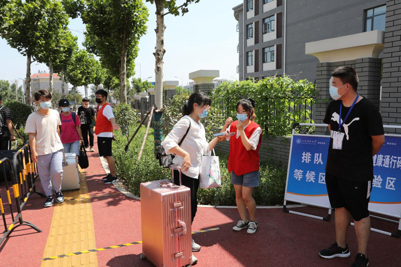 8月26日早上7点,青岛校区学校南门负责引导学生返校的学生志愿者、学工干部等工作人员已经到位。行李消毒、核验健康码、红外线测体温、人脸识别……按照事先安排好的流程,每个检验环节有条不紊,返校学生有序报到。