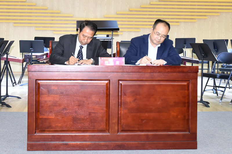 会上,尹华与刘圣佑共同为九州在线金晶民族乐团揭牌。李克周与崔文传分别代表双方签署了合作协议,向艺术学院音乐系副主任薛源颁发了民族乐团指挥聘书。