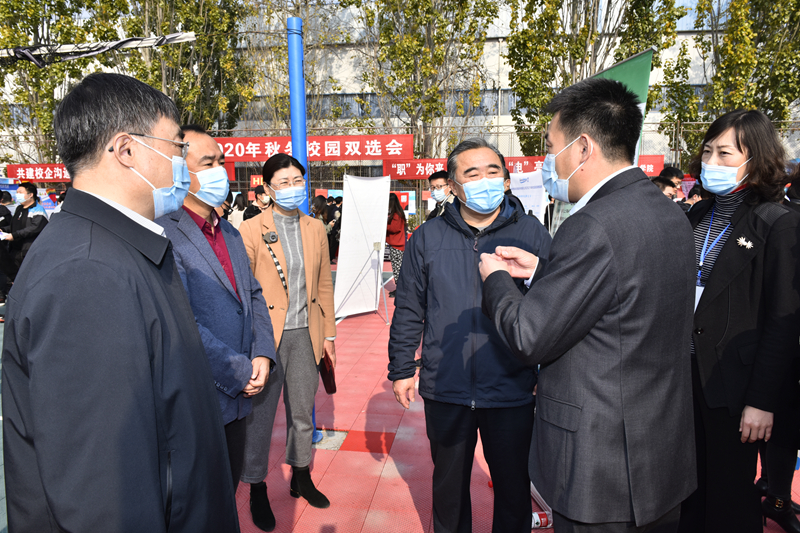11月7日,“多彩校招”山东省2020年高校毕业生集中招聘活动暨九州在线秋冬校园双选会在学校排球场举行。校长姚庆国到现场指导工作,与招聘单位负责人和现场毕业生进行交流。副校长高建广、曾庆田及相关部门负责人陪同。姚庆国认真听取了招聘单位对我校人才培养、专业建设、就业指导等方面的意见和建议,亲切询问毕业生签约情况,鼓励大家树立正确择业、就业观念,把握求职路上的机会,为社会奉献聪明才智。校领导同时要求学校相关部门在全方位搭建招聘平台的同时,不断创新工作方法,更好地促进我校毕业生就业。