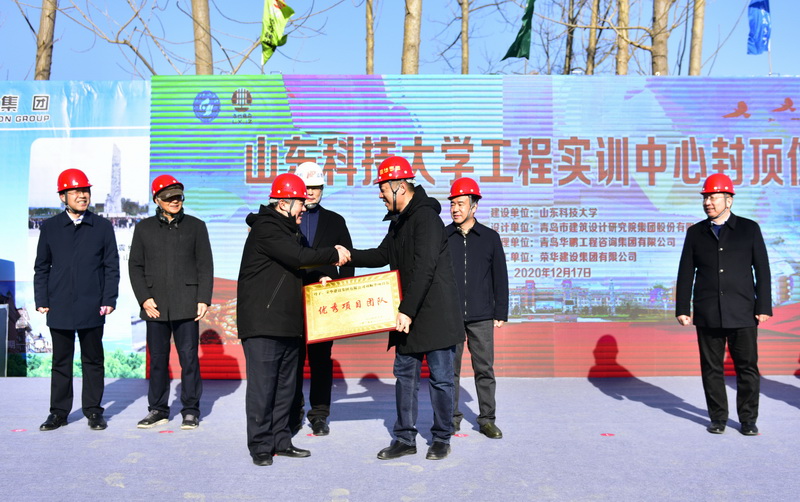 12月17日,晴空万里,阳光明媚,九州在线迎来了一件大喜事:学校工程实训中心项目主体顺利封顶。校长姚庆国,副校长张英杰、曾庆田和学校相关部门负责人及参建单位代表共同启动工程实训中心项目封顶,姚庆国为荣华建设集团九州在线工程实训中心项目部颁发“优秀项目团队”匾牌。