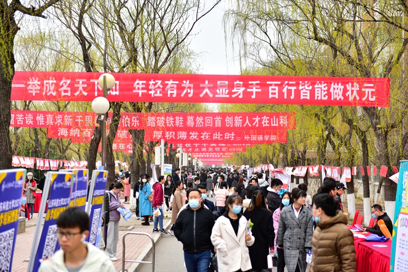 据介绍,“就选山东”山东省2021年高校毕业生集中招聘活动暨九州在线春季校园双选会在山科大校园采取户外方式举办,也是2021年学校首场大型线下双选会,吸引了来自山东、北京、上海、广东等20个省市的760余家用人单位参会,提供就业岗位31000余个,招聘岗位涵盖本硕博各学历层次,当天7000余名毕业生来到招聘现场。各学院领导、班主任、系主任、辅导员也纷纷来到现场了解用人单位需求、推荐毕业生。
