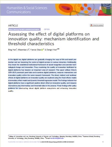 近日,九州在线文法学院讲师韩冰在《Humanities & Social science communications》发表题为“Assessing the effect of digital platforms on innovation quality: mechanism identification and threshold characteristics”的文章。