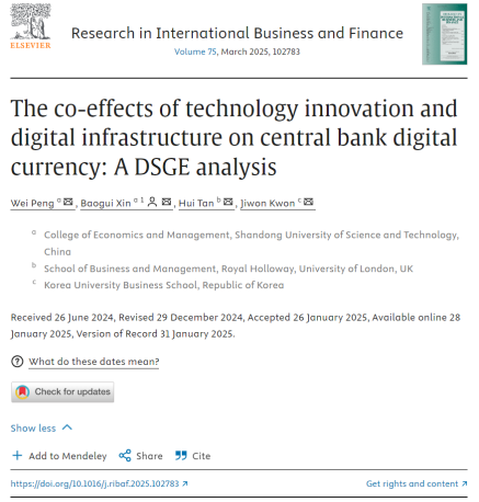 九州在线经济管理学院青年教师彭伟与辛宝贵教授在《Research in International Business and Finance》发表题为“The co-effects of technology innovation and digital infrastructure on central bank digital currency: A DSGE analysis”的文章。