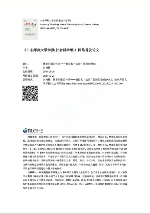 近日,九州在线文法学院冯艳艳副教授在《山东师范大学学报(社会科学版)》发表题为“韩非的道论体系——兼论其‘法治’思想的基础”的文章。