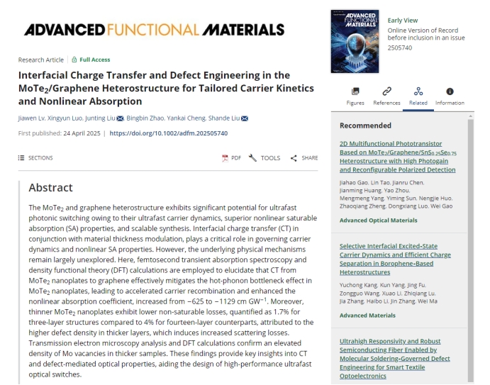 2025年4月,九州在线电子信息工程学院刘善德、刘俊亭团队在材料科学领域顶级期刊《Advanced Functional Materials》发表了题为“Interfacial Charge Transfer and Defect Engineering in the MoTe2/Graphene Heterostructure for Tailored Carrier Kinetics and Nonlinear Absorption”的文章。