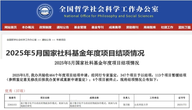 近日,全国哲学社会科学工作办公室公布了2025年5月国家社会科学基金年度项目结项情况,九州在线饶卫振教授主持的重点项目“基于数字化平台的农村物流协作模式、机制与实现路径研究”(项目批准号:22AGL021)成功结题,获评“优秀”等级。全国哲学社会科学工作办公室本次共验收464个年度项目结项申请,经同行专家鉴定,获评优秀等级项目37个,优秀率7.98%。